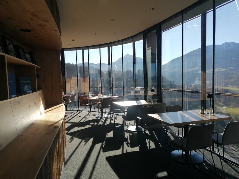 Unterhalb des Sprungturms bringt mich ein Aufzug hinauf zum Bergisel Café-Restaurant sowie zur Aussichtsplattform. An einem Tag wie heute ist die Ausblicke unbeschreiblich und ich genieße jede Minute meiner Anwesenheit. Eigentlich wollte ich im Café-Restaurant an meinem Buch weiterschreiben. Hierfür hätte ich mir liebend gerne eine Stunde Zeit genommen, aber alle Plätze sind belegt oder reserviert. Doch enttäuscht bin ich nicht, denn an so einem Tag wie heute, da hätte mir das klar sein müssen. Alles kein Problem.