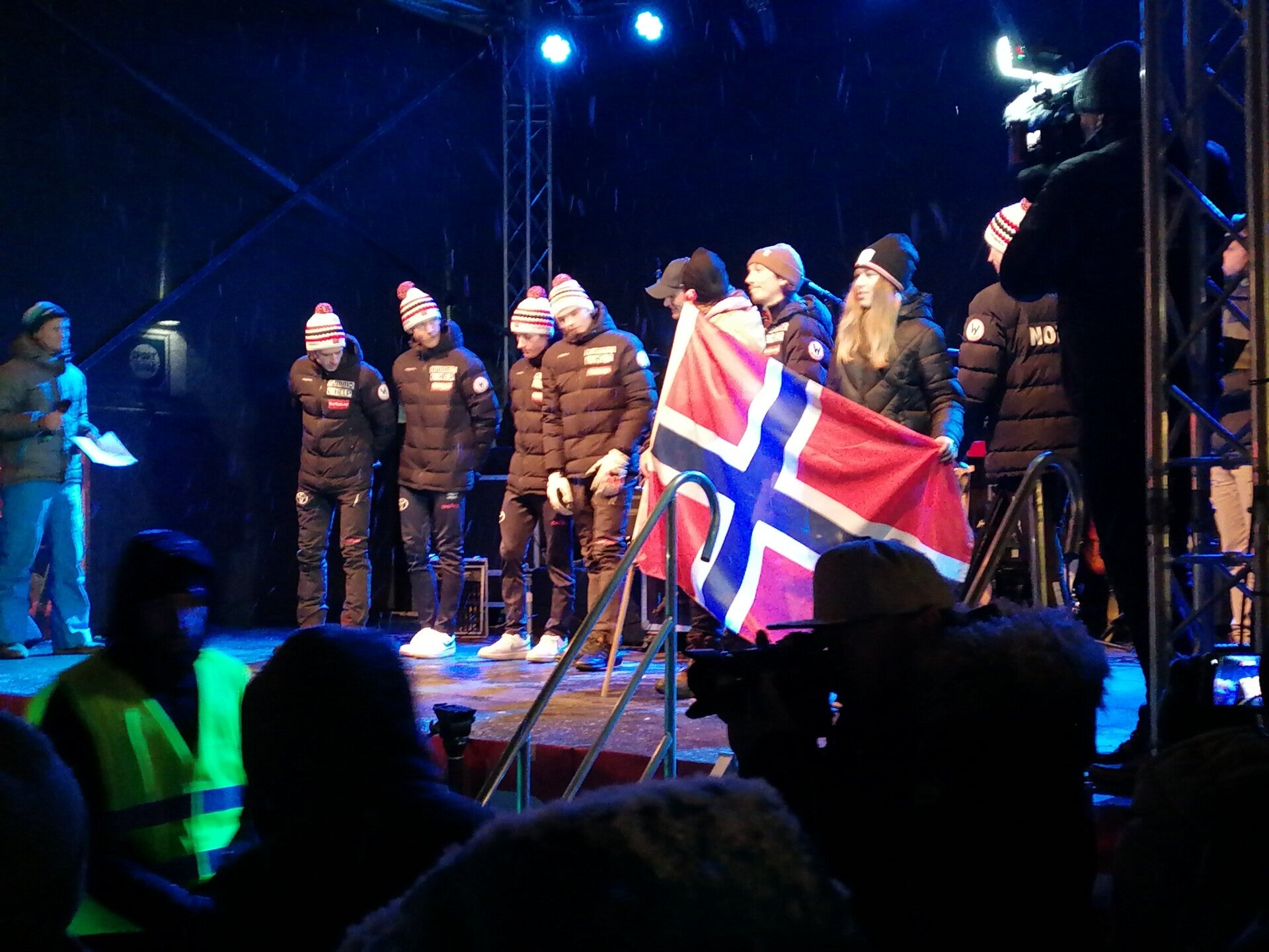 Doch wir staunen nicht schlecht, als es dann um 18:30 heißt, dass alle Skisprung Nationen, die am Skifliegen teilnehmen, auf die Bühne gerufen und vorgestellt werden. Wir haben tolle Plätze vor der Bühne ergattert und können so all die Skispringer hautnah erleben. Jede Nation wird mit großem Applaus empfangen und es bleibt auch Zeit für das eine oder andere Interview.